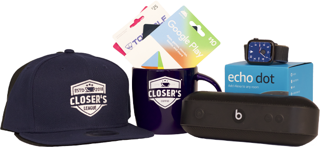Everyone knows that the key to a salesperson’s heart is recognition for their hard work and contribution. Why not leverage that personality trait, by acknowledging your star performers through a rewarding experience. By participating, you and your team become eligible for prizes you can only get with Closers. You could win swag, cool electronics devices, gift cards, trips around the world and much more.